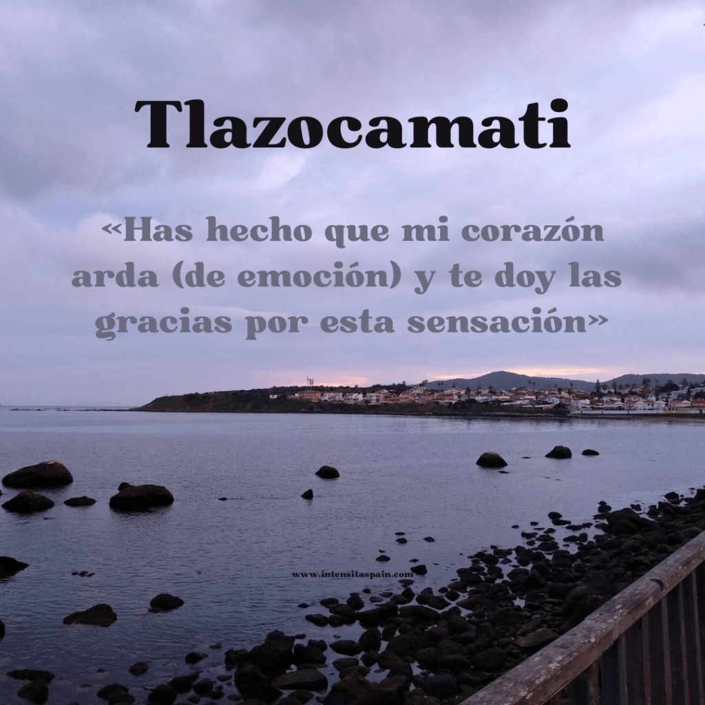 Fonética: /t͡ɬasohkɑːmáti/ Casi como se escribe. El comienzo tiene su aquel, se pronuncia /t͡ɬ/, un sonido único donde la lengua se coloca para una ‘t’ pero el aire escapa por los lados (Google AI), la z es /s/, la primera «a» es sonido largo, y el acento tónico está en «ma» (lo que a mí me resulta particularmente difícil siendo la anterior vocal larga, porque tiendo a hacer tónica la larga, o larga la tónica). Probablemente, cuando hayáis logrado dominar la pronunciación, se te haya olvidado por qué estás agradecido 😜pero ¡¡no te confundas!! Céntrate en lo que te hizo/hace que el corazón te arda de emoción 💗🔥